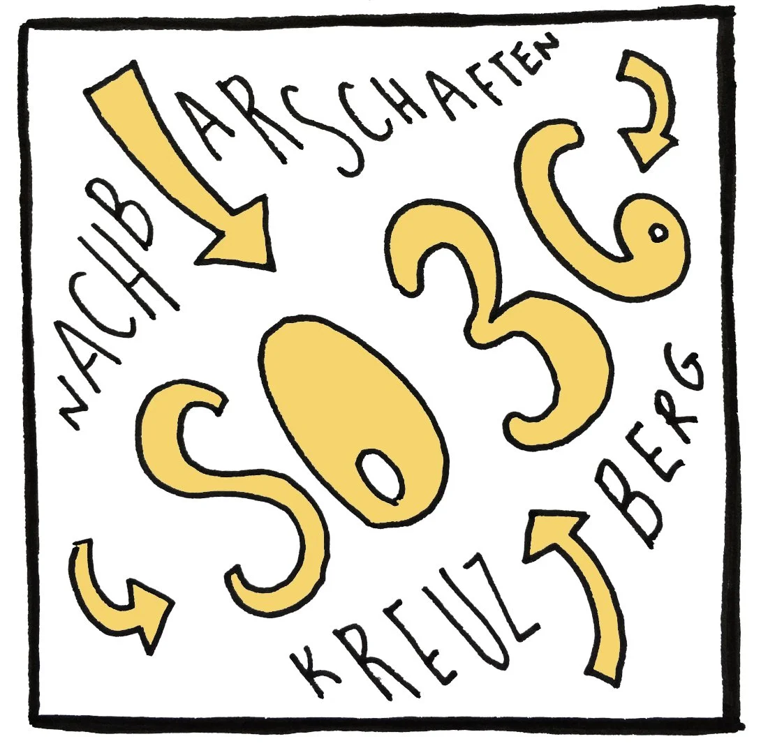 Post-Aldi consists of a system of mapping and collective information gathering of all neighborhood initiatives, groceries, start up companies, shops and services to understand the transformation of the Kreuzberg neighborhood from past to present times. A collective "add-on" map is constructed in the center of Markthalle Neun to engage inhabitants of the former so36 to participate in this scavenger hunt of what's happening around the area.